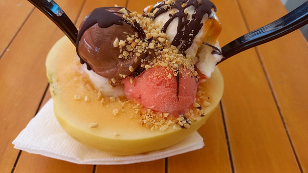Avşa tatili bize Biga Kavuna adında yepyeni bir lezzet kazandırdı. Kesinlikle bu lezzeti sizlerin de tatmanızı isteriz. Roma dondurmacısında kavun içerisinde servis edilen bu sunuma bayıldık. Hatta sadece kavun içinde değil ananas içerisinde de servis ediliyor. İçerisine istediğiniz çeşit dondurmayı koydurabilirsiniz. Üstelik fiyatı da 75 lira.